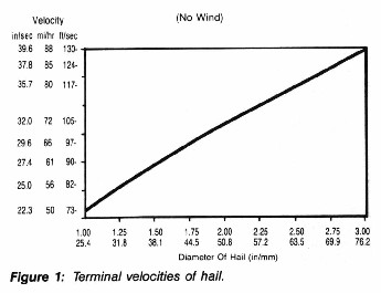 4. Terminal velocity: The terminal velocity of hailstones was originally determined by J.A.P. Lauri. These terminal velocities (see Figure 1) have been used throughout the industry in other research, particularly that performed by the National Institute of Standards and Technology (formerly the National Bureau of Standards).