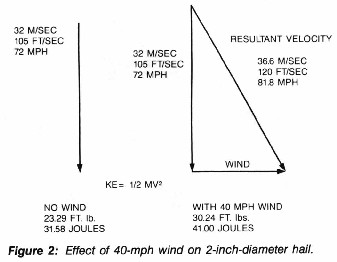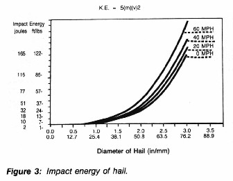 The overall increase in kinetic energy would be from 23.29 pound force (31.58 joules) to 30.24 pound force (41.0 joules), or an increase of 30 percent in impact energy. By varying the horizontal wind factor, the ultimate impact energy can be varied dramatically (see Figure 2). In reviewing this initial data, it is also interesting to note the overall difference in impact energy between hailstones with diameters of I inch (25.4 mm) and 2 inches (51 mm). Increasing the diameter of the hail from I inch to 2 inches increases the ultimate impact energy from less than I foot per pound (1.4 joules) to approximately 22 foot per pound (29.83 joules—see Figure 3). The approximate impact energy obviously increases on an exponential scale, which is determined by the mass and the increase in terminal velocity. These two factors, mass and velocity (which are both increasing exponentially), cause a dramatic increase in the impact energy with small, incremental fluctuations of hail diameters.