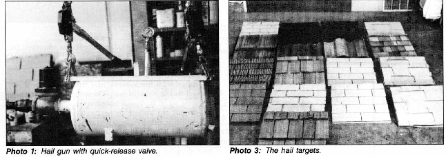 All hail was fired at its terminal free-fall velocity (Figure 1). Concrete tile targets were then impacted in a secondary test with hail at speeds higher than normal terminal velocity to simulate the effects of high horizontal winds, A fiberglass three-tab assembly over a plywood deck was subjected to three surface temperatures—60 F(15.6 C), 80 F (27 C) and 120 F (49 C)—for hail damage evaluation with a 2-inch (51-mm) hailstone. The effects of higher and lower surface temperatures were then evaluated.