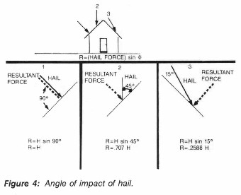 Each sample was impacted by hail 15 times. This included five different sizes of hail—% inch (19 mm), I% inch (32 mm), I % inch (44 mm), 2 inch (51 mm) and 21/2 inch (64 mm)—impacting at three different angles of impact (15, 45 and 90 degrees—see Figure 4). A variation in the angle of impact from 15, 45 to 90 degrees produces a resultant force ranging from 25.88 percent, 70.7 percent and 100 percent, respectively. Simulated hailstones were frozen in molds at approximately 10 F (12 C). The hailstones were quickly removed, placed in the gun barrel and fired within 30 seconds of loading. Following the impact of each specimen, results were recorded. Tests were performed at a room temperature of about 80 F (27 C).