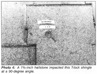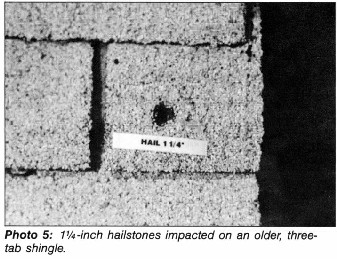There did not appear to be a visible difference in hail resistance between organic and fiberglass threetab products. The three-tab, assembly-type shingles, however, did have a higher hailstone resistance than T- lock shingles (see Photo 4). This increase in hail resistance appears to be a result of the smoother, flatter installation of the three-tab shingles. The heavier-weight, laminated shingles (Target No. 7) offered a slightly higher hail resistance to that of other fiberglass shingles in that a fracture did not occur until 2-inch hail (51-mm) at a 90-degree angle impacted the target. It should be pointed out, however, that the damage was not readily visible, and could not be observed until the shingle was desaturated. The older, organic three-tab and T-lock shingles exhibited a very low threshold of hail resistance (see Photo 5). As shingles age, asphalt within the shingle obviously hardens and becomes somewhat more brittle. This creates a situation in which tow residences could be next door to one another, and one residence could sustain damage to a slightly older roof, while the other residence could have virtually no damage with a new roofing system. When a roof system is overlayed, there is an increased void space between the new and old shingles. This is particularly evident in the case of new T-locks installed over old T-locks, In this situation, as demonstrated by Target No. 13, a fracture occurred with hail as small as I ~ inches (32 mm) fired at a • 90-degree angle. All asphalt shingles had a fairly low threshold of damage when the impact occurred at the butt edge (or shingle cutout) in a three-tab assembly. This typically produces a somewhat semi-circular break at the leading butt edge. Although this may not effect the performance of the shingle, it may cause some slight problems from an aesthetic standpoint.