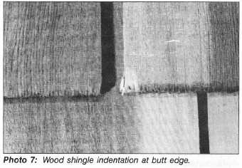 This can obviously be due to the different thicknesses of the wood, points of impact, and non-uniform surfaces and sub-surfaces. An example is the '/2 inch (13-mm) No. I red cedar handsplit medium shingle, where, at a 90-degree angle of impact, splits developed in the shingles with hailstones of I Vf inches (32 mm) and I % inches (44 mm). Indentations occurred, however, with 2-inch (51-mm) hail followed by fractures with 214 -inch (64-mm) hail. The thicker wood shingles did not necessarily result in higher hailstone resistance. The thinner red cedar shingles (% inch or 9.5 mm) with smoother surfaces and a greater uniformity in the substrate produced hailstone resistance equal to the thicker shingles. Some indentation of the wood shingles did occur at the leading butt edge and at the joint of the shingles. The bulk of this damage is somewhat superficial, and began at a fairly low threshold of kinetic energy (see Photo 7).