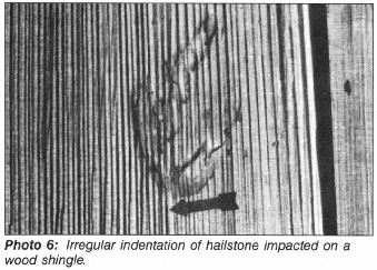 The three wood shingles that were tested exhibited various degrees of indentation, which occurred at very low thresholds of kinetic energy. When the wood shingles were impacted with hailstones from "A inches (19 mm) in diameter to I % inches (44 mm) in diameter, fairly uniform indentions occurred. The indentations, depending upon the angle of impact, were either circular or somewhat elliptical. Damage in this particular area, for the most part, was superficial, and would not effect the overall performance of the roofing system, When the wood shingles (Targets No. 15 and 16) were impacted with hailstones I % inches (44 mm) or larger, the shape of the indentation was not uniform (see Photo 6). This was due to two factors: One, the hail tends to crush and rotate somewhat as it impacts the shingle; two, because the surface of the wood shingle is irregular, the indentation becomes erratic. The threshold for damage within the wood shingle was not clear-cut.