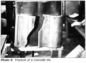 The three concrete tile targets all exhibited fairly high degrees of hail resistance.Fracture/breakage did not occur with the 2 '/a -inch (64-mm) hail at a 90-degree angle of impact. Fracture/breakage did occur, however, when the velocity was increased to 131 feet per second (40 meters per second) or 89 mph, resulting in kinetic energy of 71.49 feet per second (96.9 joules— see Photo 8). The flatter concrete tile shingle was the most hailresistant concrete tile product tested. Multiple impacts with 2%-inchhh (64-mm) hail was required before fracture/breakage occurred.